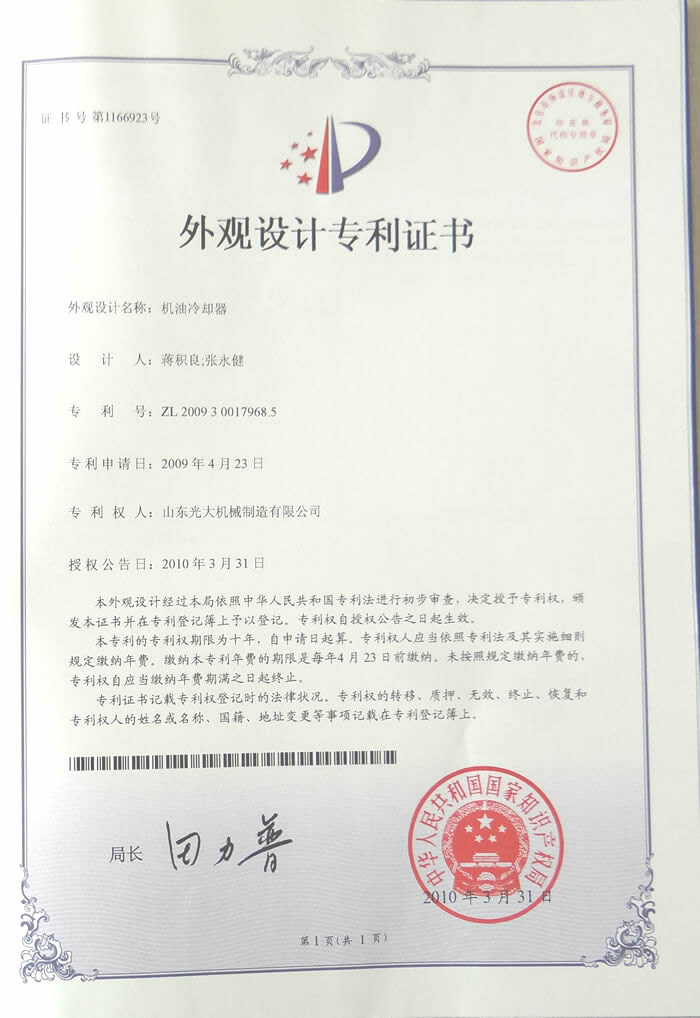 机油冷却器-外观设计专利证书