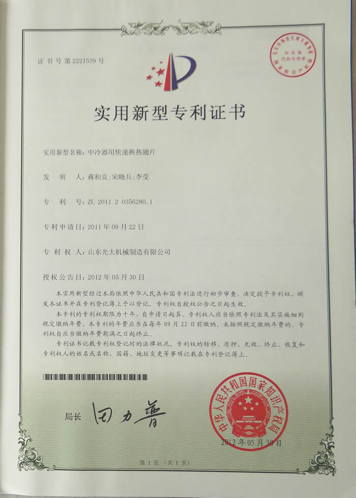 中冷器用快速换热翅片-实用新型专利证书